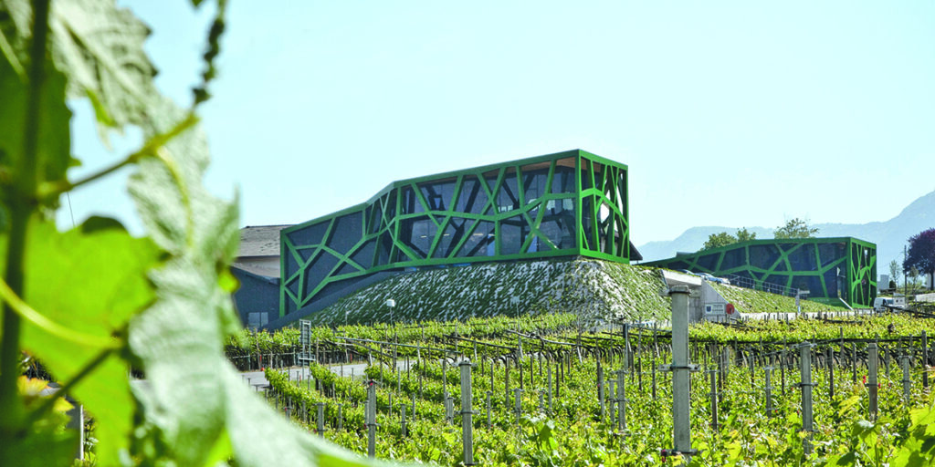 Anche le Cantine sociali possono avere un’eccezionale sede d’autore. Tramin, storica realtà cooperativa altoatesina di Termeno, con 300 soci conferitori, 250 ettari di vigne e quasi 120 anni di storia, nel 2007 ha chiesto all’architetto Werner Tscholl di riprogettare, ampliandolo, il proprio stabilimento. La nuova struttura, ultimata nel gennaio 2010, occupa 6.292 metri quadrati ed è concepita a ricordo di una vite, traducendo in spazi e moduli architettonici le caratteristiche morfologiche della pianta e la sua funzione rispetto al territorio, il legame profondissimo con la terra e con chi la coltiva.